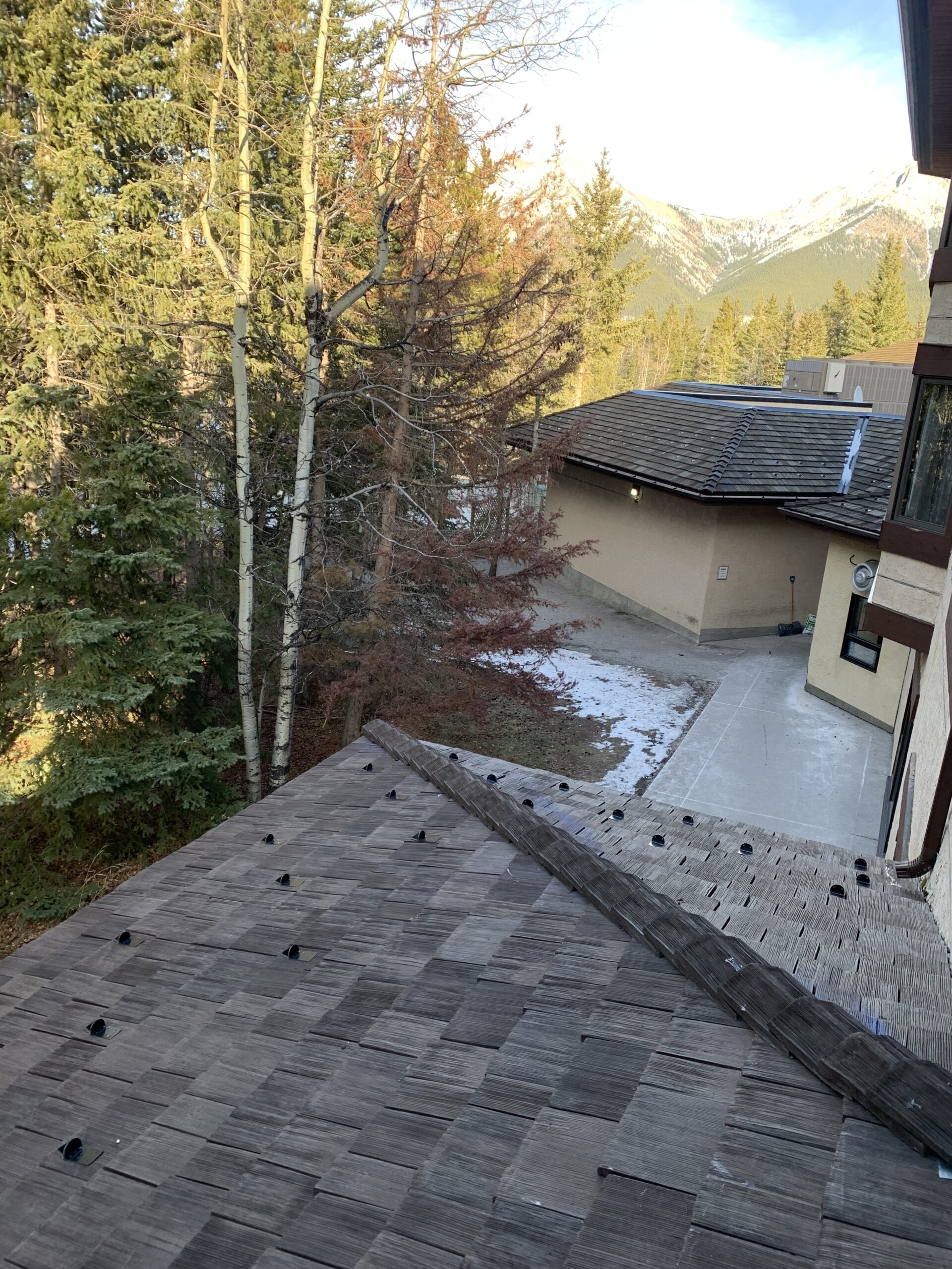The rooftop also features VMAX 301 ventilators by Ventilation Maximum, a Quebec-based company known for their high-performance, storm-resistant ventilation systems further enhancing airflow and attic health in the challenging mountain climate. These ventilators are engineered to stand above the snow line, ensuring continuous function through heavy winters, and deep snow loads. To address seasonal snow accumulation, Alpine SnowGuards PD30R snow retention systems were installed to safely manage snow loads and reduce the risk of sudden rooftop snow releases at the eaves.